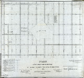 Plan (alternate image), Plan of the survey and regulation of the First Section of the 21st Ward between 11th and 20th Streets and Columbia and Susquehanna Avenues [Ordinance Aug 15, 1855; survey returned August 1856; approved July 6, 1857; confirmed by Court June 11, 1860] Original size: 43 x 46 in. (estimated)