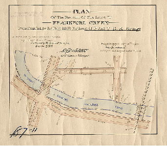 Plan, Plan of the revision of the lines of Frankford Creek from Frankford Ave. to a point 145 ft. northwest of P. and T. R.R. Bridge [Ordinance June 27, 1900; confirmed Nov. 19, 1900] Original size: 12 x 13 in. (estimated)