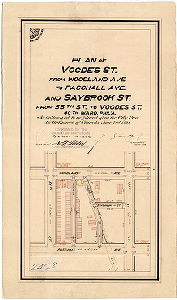 Plan, Plan of Vogdes St. from Woodland Ave. to Paschall Ave. and Saybrook St. from 55th St. to Vogdes St., 40th Ward, Phil's. [Ordinance June 2, 1898; survey returned July 11, 1898; confirmed Oct. 17, 1898] Original size: 12 x 20 in. (estimated)