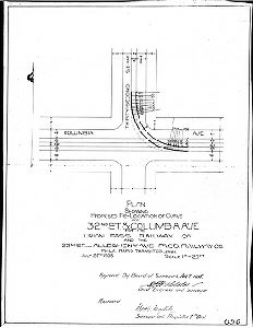 Plan, Plan showing proposed re-location of curve at 32nd St. & Columbia Ave. for the 22nd St. and Allegheny Ave. Pass. Railway Co. [Approved by Board of Surveyors Aug. 7, 1905], 1905 Original size: 14 x 18 in. (estimated)