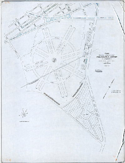 Plan (adjusted), Plan showing tentative layout, Philadelphia Airport, Landplane, Penrose Avenue and Island Avenue, 40th Ward, Philadelphia., 1931 Original size: 26 x 34 in. (estimated)