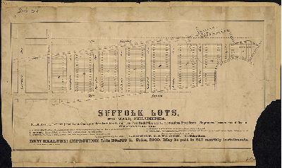 Plan, Suffolk Lots, 27th Ward, Philadelphia … One square from Suffolk Park, 8 minutes from Paschalville, and 14 minutes from Broad Street. Stage meets Trains at Paschall Station … Dry! Healthy! Improving! Lots 25 x 100 ft. Price $100. May be paid in $10 monthly installments. Dan F. Gillin, Printer, 717 Sansom St., Philada., 1888 ca. Original size: 23 x 39 in. (estimated)