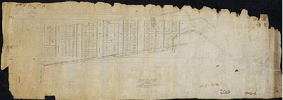 Plan, Plan of a tract of land in the 27th Ward Phila. Belonging to George Laycock as proposed by him to be laid out into streets and lots. [On reverse: Jones [?] the [?] Oct 18[?] [Working plan for Suffolk Lots, see SD7th-FC5-15 and SD7th-FC5-16-2], 1888 ca. Original size: 18 x 49 in. (estimated)