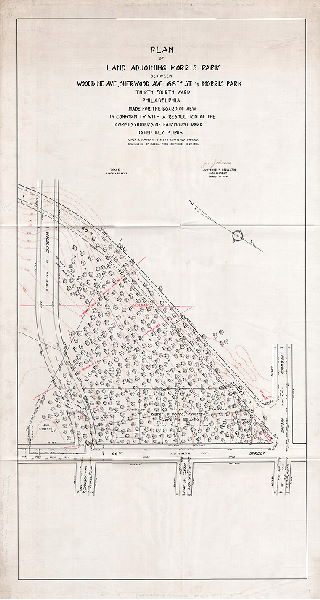 Plan, Plan of land adjoining Morris Park between Woodbine, Sherwood Ave., 66th St. and Morris Park, Thirty-fourth Ward, Philadelphia. Made for the Board of View in conformity with a resolution of the Commissioners of Fairmount park dated July 12, 1916. Lines and grades of streets confirmed 1-4-1909. Boundaries of Morris Park confirmed 12-29-1915. Original size: 23 x 44 in. (estimated)