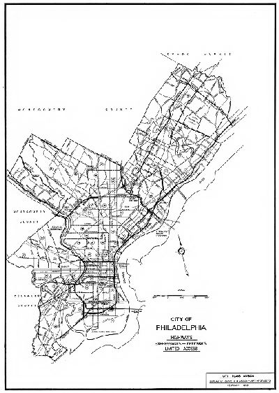Plan, City of Philadelphia, Highways. Expressways -- Freeways. Limited Access. City Plans Division, Bureau of Surveys and Design, Department of Streets, February 1959. Original size: 28 x 39 in. (estimated)