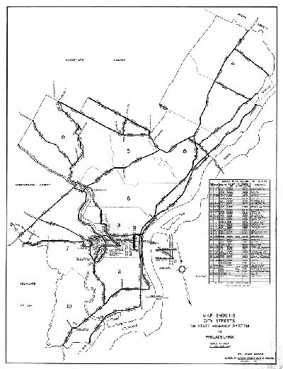 Plan, Map showing city streets on state highway system in Philadelphia. . City Plans Division, Bureau of Surveys and Design, Department of Streets, January 1961, 1961 Original size: 36 x 47 in. (estimated)